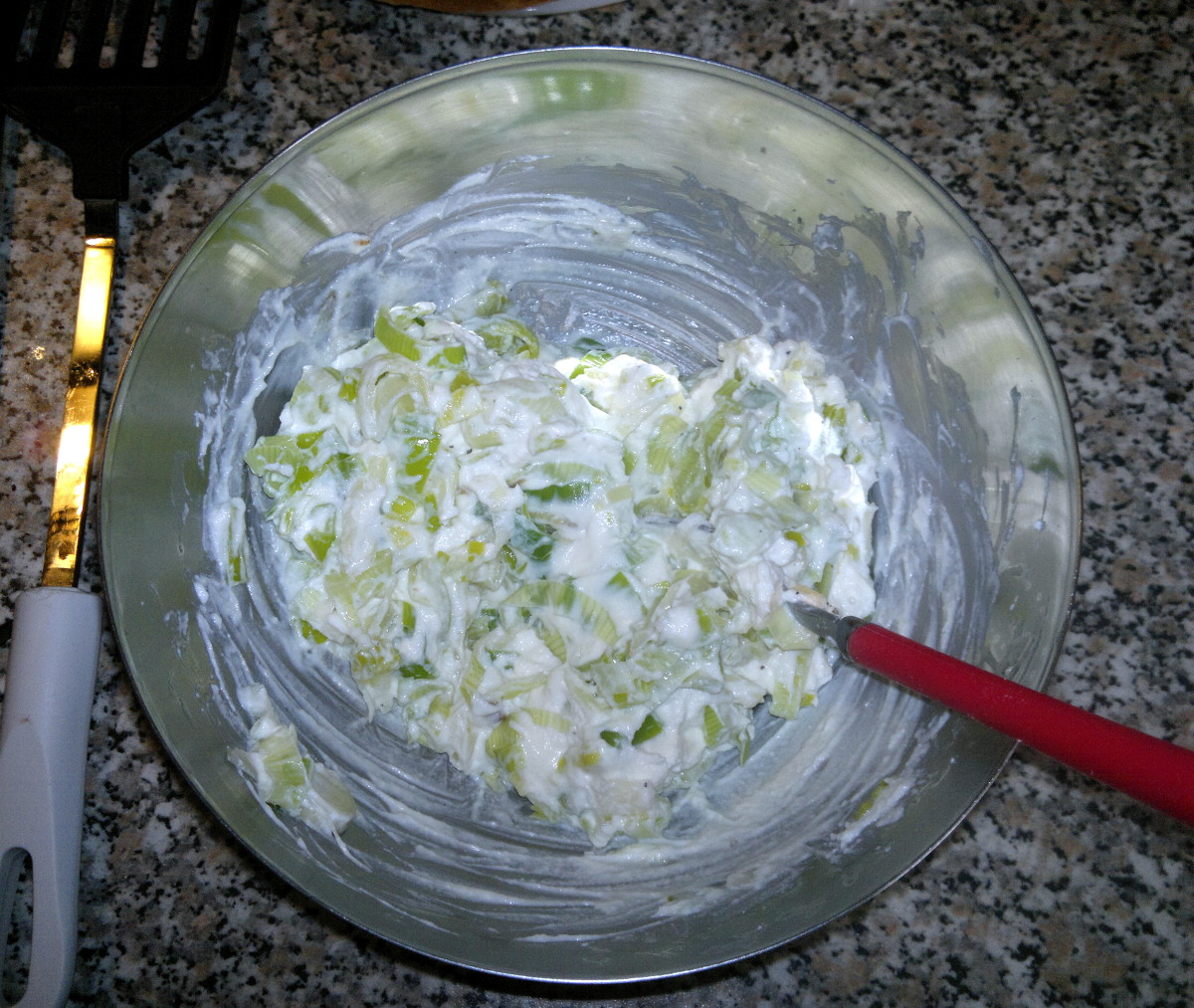 Meanwhile prepare the filling. Wash and clean the leek and chop it in slices. Warm up the oil in a fry pan and stew the leek for about 10 minutes or until tender. Adjust in salt and pepper. Put them in a bowl and add ricotta, parmesan, salt and pepper if needed.