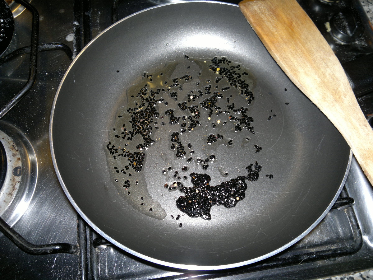 Mentre il dhal cuoce versare l’olio in una padella. Tostarvi i semi di cumino nero per al massimo un paio di minuti,