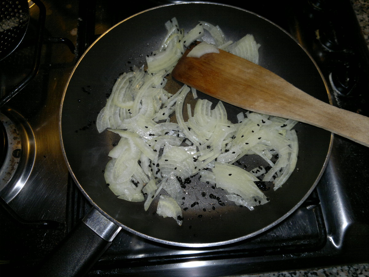 Pour the oil in a pan and toast the black cumin for a couple of minutes, then add the onion thinly sliced. Cook for 5/10 minutes, until onion is lightly brown.