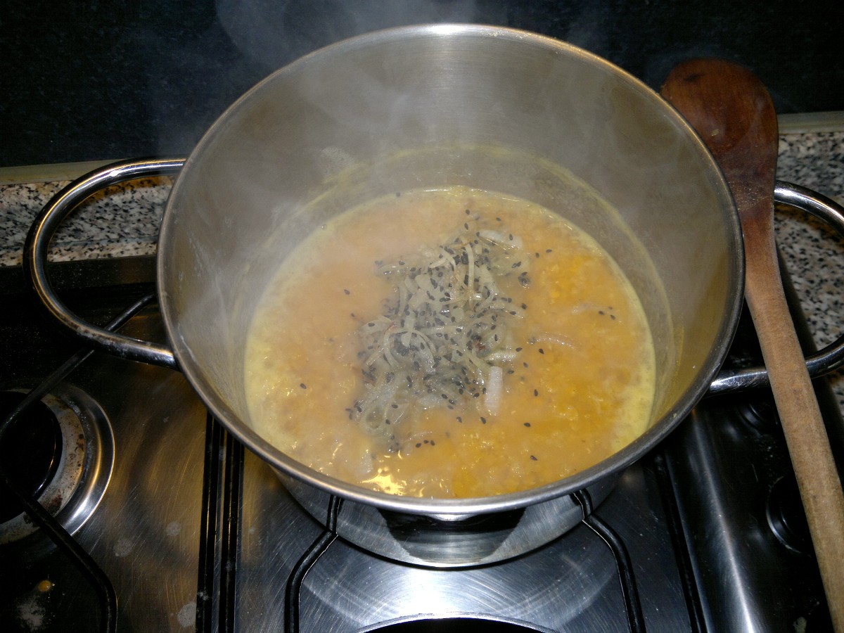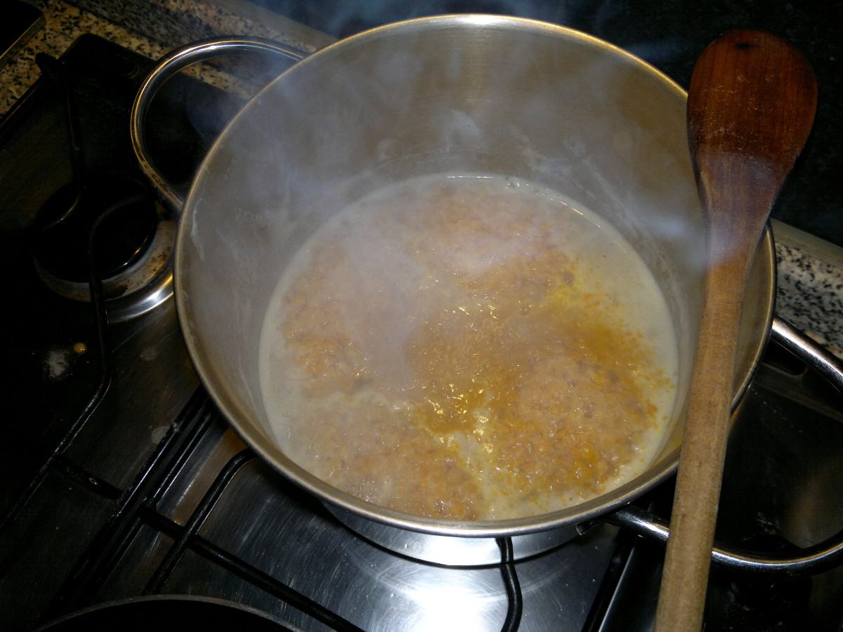 Accendere il fuoco e appena il tutto raggiunge il bollore abbassare, eliminare eventuale schiuma dalla superficie e unire la curcuma e il sale.