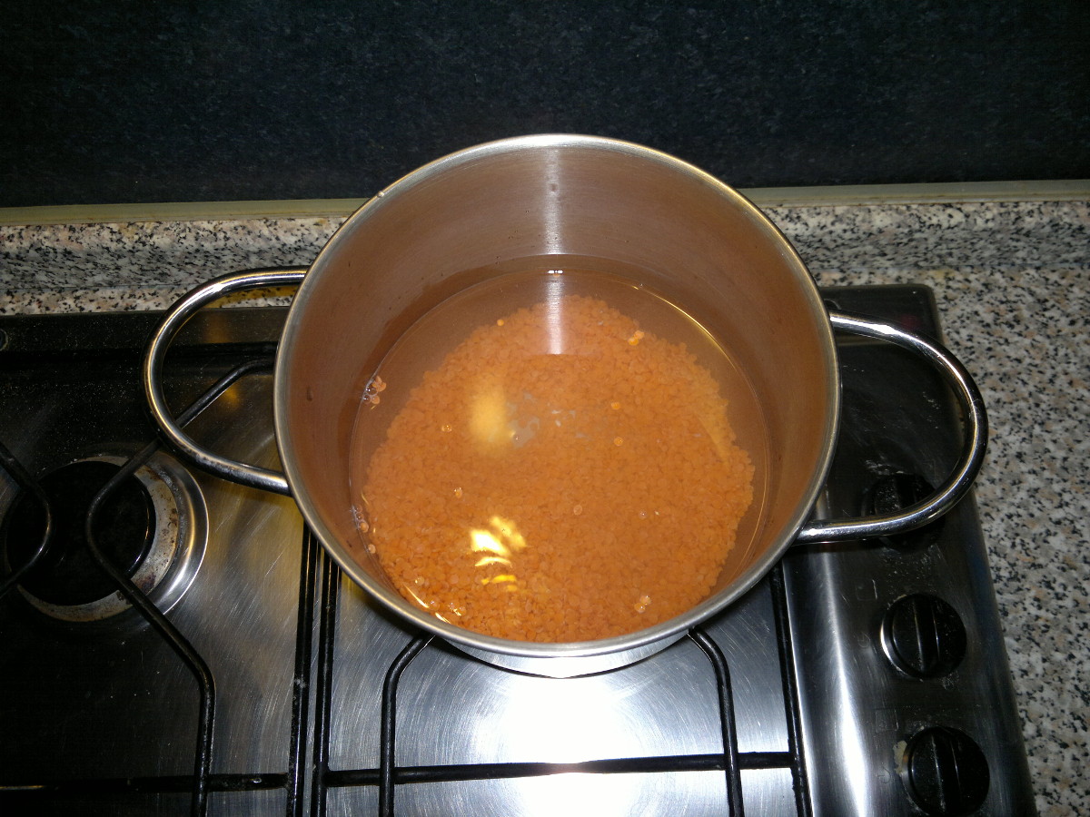 Put in a large pot red lentils with cold water. Warm up and when it is boiling low the stove and add turmeric and salt. If necessary remove the foam.