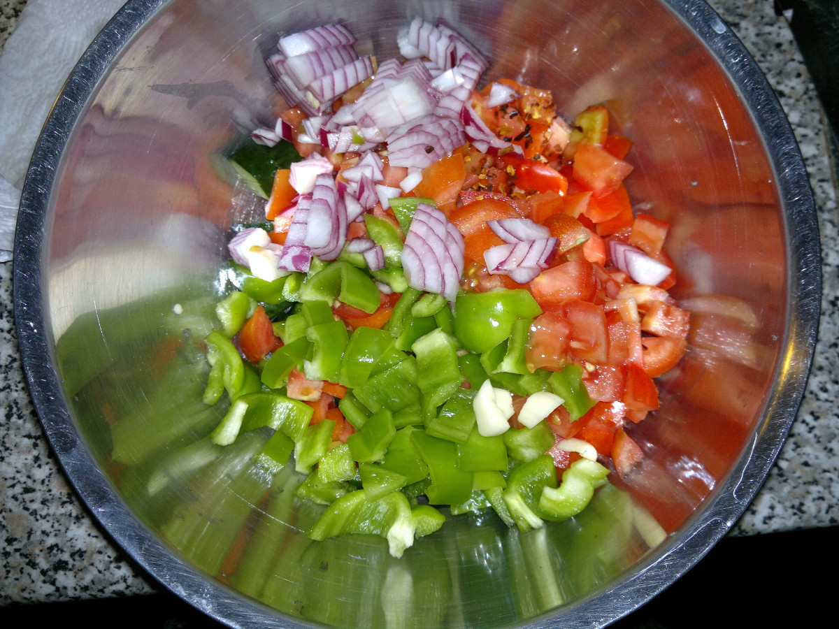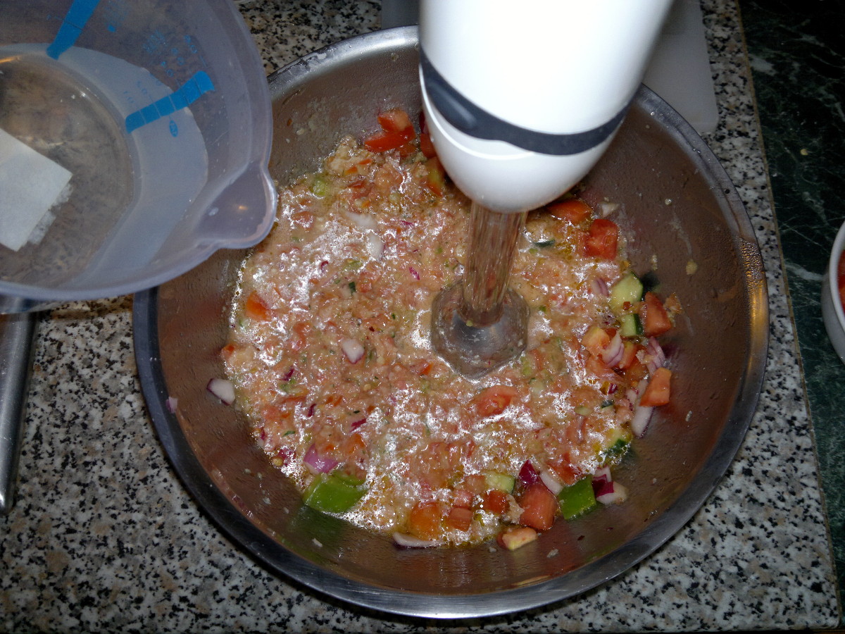 Chop the tomatos (keeping 1 apart for decorate), half onion, the garlic, the green pepper, one cucumber and the chili pepper. Mix all with the bread and vinegar, half of the oil and salt, cover and let rest in the fridge for about 12 hours.