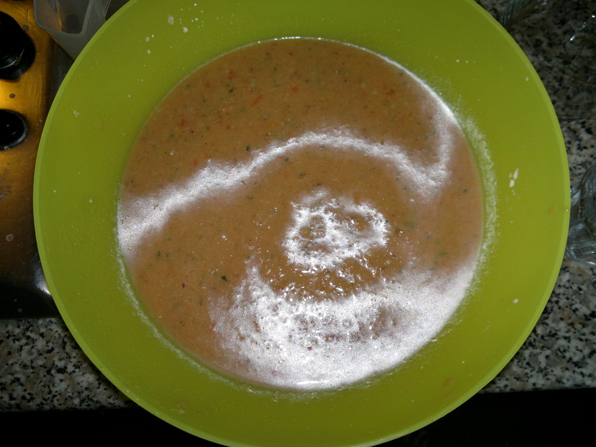 Poi frullate il tutto aggiungendo alternativamente acqua e l’olio rimasto (io ne ho messi solo 50 ml in questo passagio).