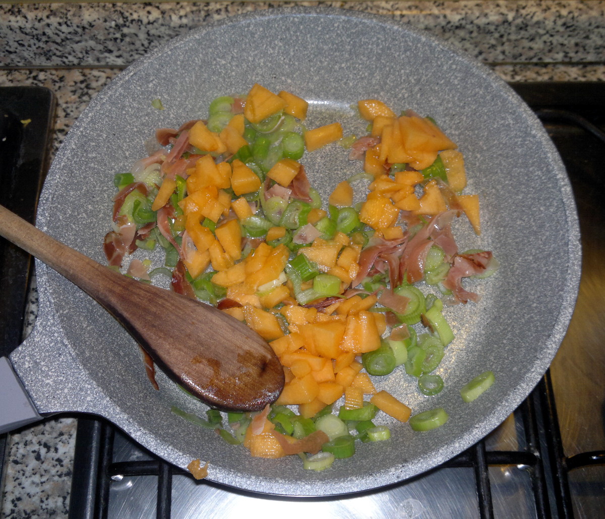 Affettate finemente la parte verde di due cipollotti e fatela insaporire in padella per 3 minuti con un paio di cucchiai di olio, un cucchiaio di succo di limone, metà dello speck a striscioline e 80 g di polpa di melone tritata.