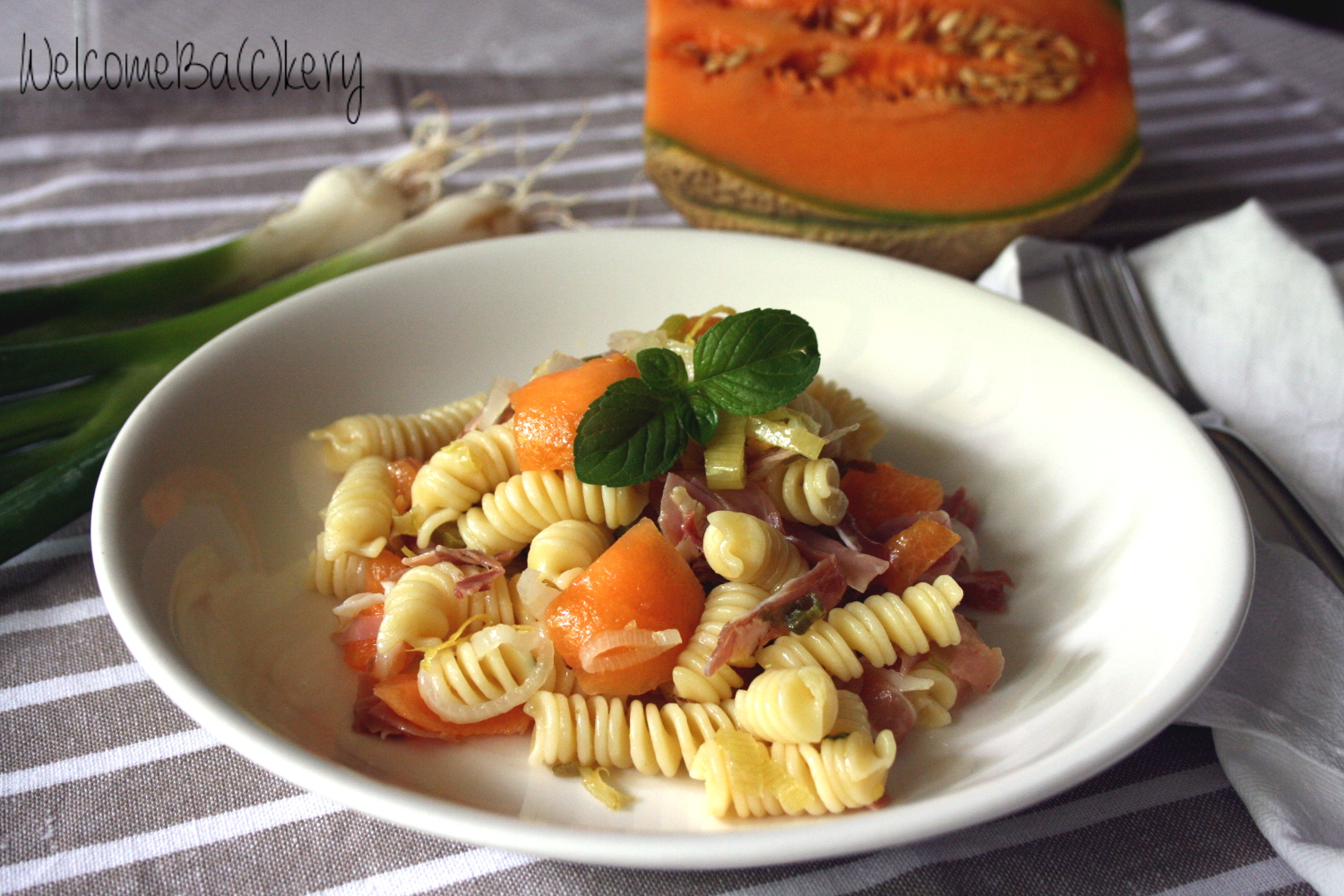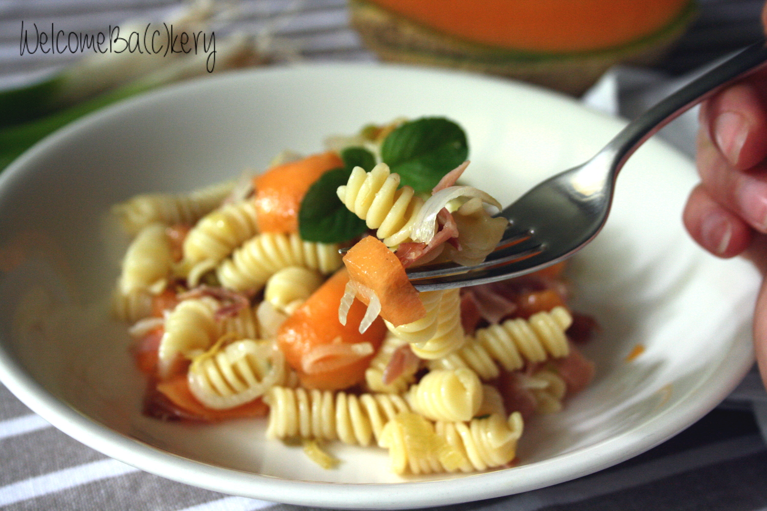 Pasta salad with melon, speck and fresh onions