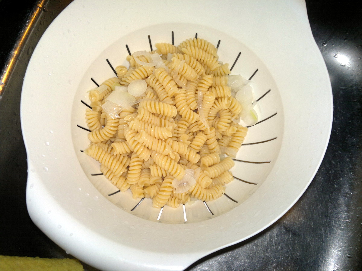 Boil abundant salt water and cook pasta in it, al dente. When it takes a couple of minutes to cook the pasta add to the water the sliced fresh onions, only the white part.