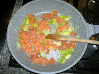 Nel frattempo pulite ed affettate sottilmente il porro. Scaldate l’olio in una padella e fatelo soffriggere dolcemente. Togliete la pelle e le lische al salmone e riducetelo a cubetti.