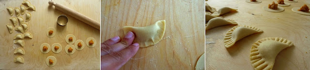 Con un coppa pasta tondo formare i tortelli (io ho usato quello da 5cm di diametro). Porre al centro una piccola quantità di ripieno, inumidire i bordi del disco con poca acqua, richiudere su se stesso partendo dalla zona del ripieno verso l’esterno, per non creare bolle d’aria all’interno. Sigillare con una forchetta i bordi.