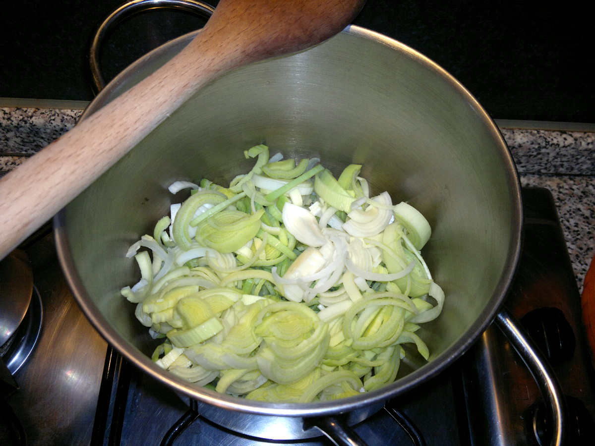 Mondate ed affettate il porro, fatelo rosolare in una pentola con due cucchiai di olio e due cucchiai di acqua per qualche minuto.