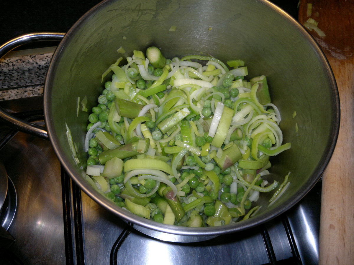 Add asparagus and peas to the leeks and brown again for five minutes stirring constantly. Add hot broth, cover and cook for about 20 minutes.