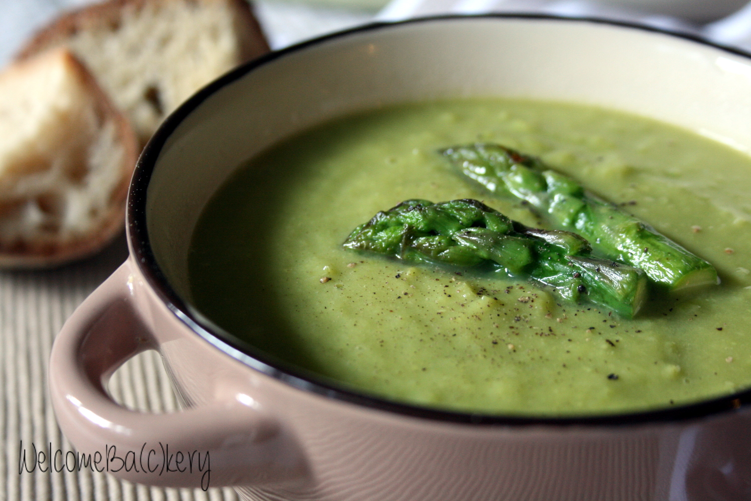 When is time to serve warm up the soup, divide it onto the dishes, distribute over it the asparagus’ tips, sprinkle with pepper ans serve.