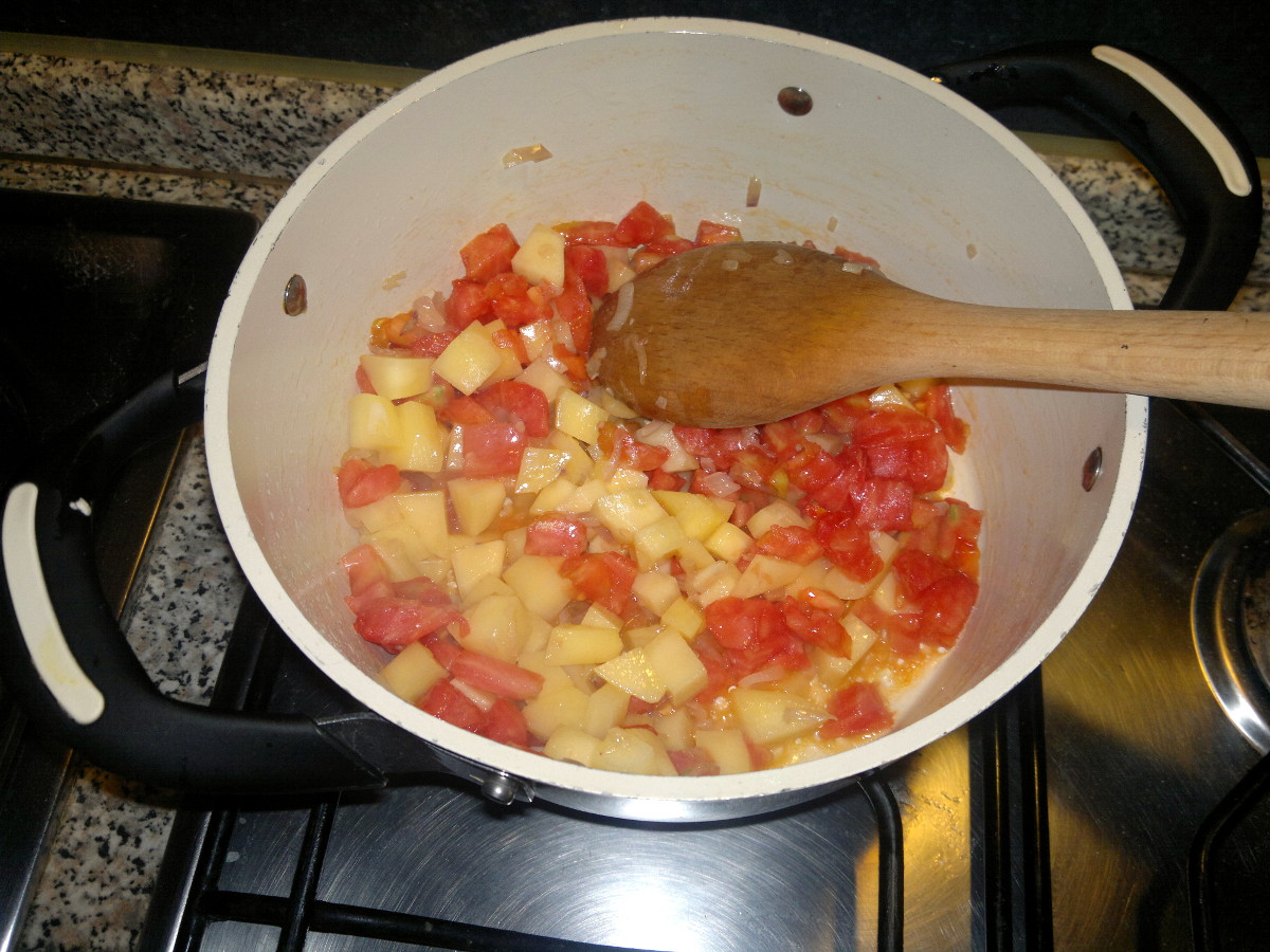 Add the potato in cubes and cook for few minutes, then add the tomato in cubes.
