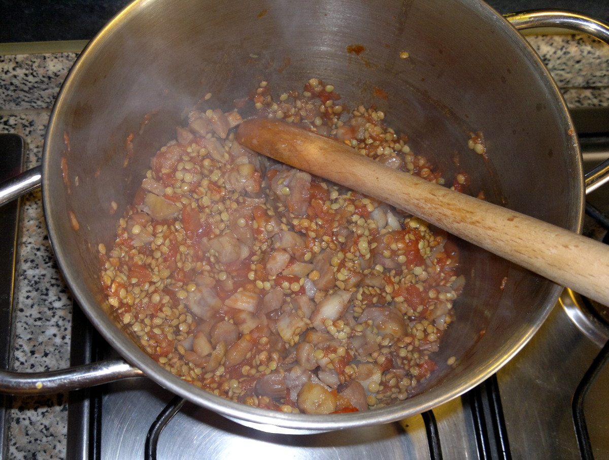 Eliminate l’aglio e unite le lenticchie e le castagne tagliate a pezzetti.