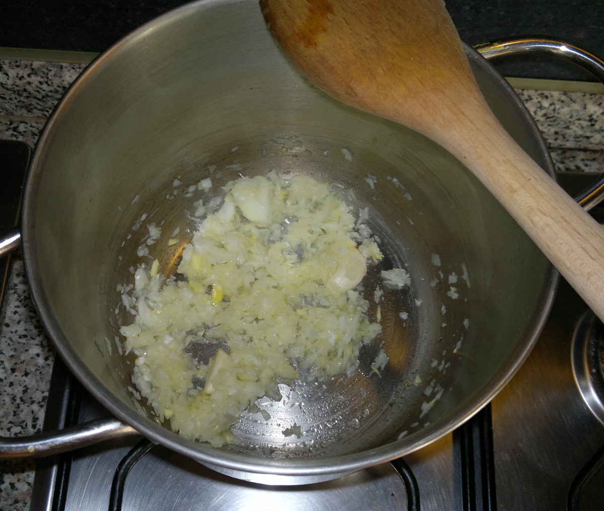 In una capiente pentola scaldate l’olio e rosolatevi la cipolla tritata con i due spicchi d’aglio sbucciati.