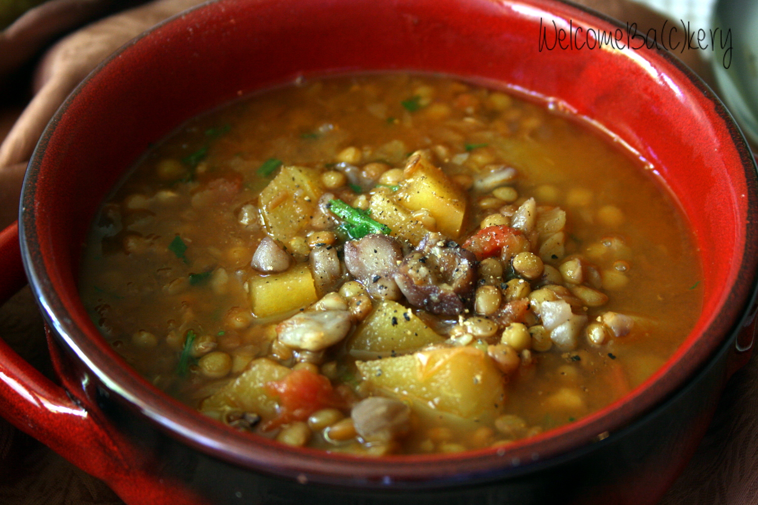 Non so se sia una ricetta tradizionale o che altro, ma è la zuppa di lenticchie più buona che abbia mai mangiato, imbattuta ormai da anni!