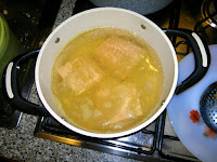 Remove fishbones and cut salmon in slices. Boil the broth and sear the salmon in it for few minutes. Drain it and let cool down.