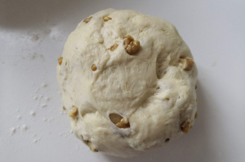 Chop the walnuts and set aside. In a bowl, sift the flour and mix it with the brewer’s yeast. Make a well and add honey and oil in the center. Mix the lukewarm milk mixed with the water a little at a time, stirring wih a fork. When the mixture has taken on consistency, start kneading by hand and add the salt. Knead vigorously for at least 10 minutes, until the dough is smooth and elastic. Form a ball and put to rest in the lightly greased bowl, cover with cling film or a damp cloth and let rise in a warm and sheltered place.