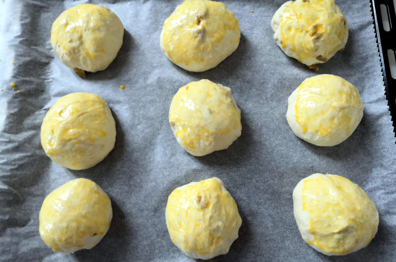 When the dough has doubled in volume (the times depend on the liveliness of the yeast and the ambient temperature) take it back and gently open it on the lightly floured work surface. Distribute the walnuts, roll and knead briefly to distribute them. Now divide the dough into about 9 pieces weighing 60 g, give each one the shape of a ball and place them on the baking tray covered with baking paper. Cover with film and let rise for half an hour. Heat the oven up to 180 ° C, and beat the egg yolk together with the spoonful of milk. When the breads are ready to be baked, brush them with the yolk and cook for about 20-25 minutes or until well browned. Serve warm or at room temperature.